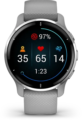 Your health dashboard. You can capture a 2 minute session and record key health statistics including heart rate, heart rate variability, Pulse Ox, respiration and stress. From this session you can generate a report to share via the Garmin Connect app on your compatible smartphone.